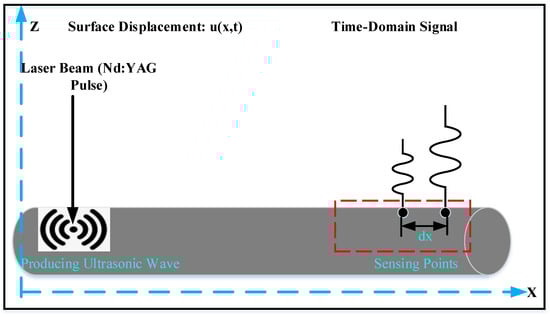 Owing to the recent advancements in laser ultrasonic technology, lasers may now be utilized to make and identify ultrasonic waves [56]. This ND technique has been utilized to characterize materials, quantify material thickness, and find faults. A laser ultrasonic generator produces a laser ultrasonic device including an interferometry sensor and transducer, which are all run through the pipelines. Internal corrosion in hollow metallic components was detected and located using the laser ultrasonic of Liu et al. [57]. Piezoelectric transducers with an operating frequency of 125 MHz and broadband laser-ultrasonic are utilized to create waves that interact with the pipeline corrosion. Then, the variation in the generated wave modes is assessed based on time-frequency decomposition methods. A laser beam is created and senses the non-corrosive surface at the face side, where the reflection method is employed, as illustrated in Figure 5. A pulsed Nd: YAG laser has been utilized to make an ultrasound [58]. A TEMPO laser ultrasonic receiver detects the reflected ultrasound. The detector generates an analog voltage over time, which is proportional to the instantaneous displacement at ultrasonic frequencies. Scanning the specimens to detect pipeline corrosion can generate geometric images of corrosion. The main drawback of this method is that it requires access to the material surface of the specimen under test. Moreover, laser-ultrasonic applications are very limited and sensitive to surface-breaking issues.