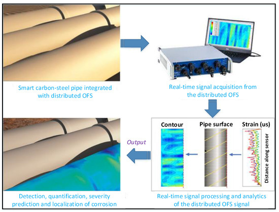 - Tan, X.; Fan, L.; Huang, Y.; Bao, Y. Detection, visualization, quantification, and warning of pipe corrosion using distributed fiber optic sensors. Autom. Constr. 2021, 132, 103953. [Google Scholar] [CrossRef]