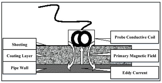 One of the most useful methods is eddy current monitoring, which detects and assesses the corrosion of the conductive materials. In this technique, the conducting coil, including an AC, is placed near the specimen to form an initial magnetic field around the coil in an axial direction [64]. From another aspect, the electrical current forms its own secondary magnetic field in the opposite direction from the magnetic field of the conducting coil, which contradicts Lenz’s Law [65]. The interaction between the conducting coil’s magnetic field and eddy current magnetic field is studied using sensors or coils, as shown in Figure 7.