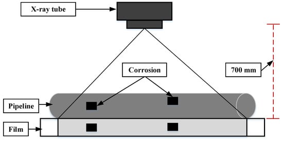 ND radiography monitoring is becoming one of the most common systems, which change the attenuation of penetrating radiation in structures as a function of radiation energy, thickness, and density. The corrosion causes the variation of the transmitted radiation intensity. As a result, radiographs are effective in detecting flaws, corrosion, and welds in metal [92]. An X-ray tube integrated with a 160-kV generator and a (1:5 mm × 1:5 mm) focal spot was used to investigate corrosion in coated steel materials, as shown in Figure 12 [93]. The current and voltage of the X-ray tube are tuned to 10.7 mA and 150 kV, respectively. The exposure period is set to 190 s for mapping corroded regions in 11-mm thick tested samples. To get the concealed corrosion during the radiography experimentation, the single wall and picture approaches are applied. With the sample under test, the film is kept intact. The gap between the film and the X-ray source was set up at 700 mm to reduce the distortion and geometric un-sharpness. The suitable image quality indication is used to produce a radiographic image sensitivity of 2%. The radiograph image was digitized with a 50-micron resolution using the Model Array 2905 film digitizer.