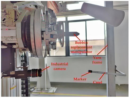 The creel positioning system is mainly composed of a creel yarn changing manipulator, an industrial camera, a creel rod, an industrial computer and other equipment [27,28]. The industrial camera is installed on the special platform of the bobbin yarn changing manipulator, with good field of vision and no interference. The bobbin yarn changing manipulator is suspended on the truss robot and can follow the truss to move to any position of the yarn frame in the yarn using area. Moreover, it is used to realize the function of grasping and placing the yarn bobbin yarn. The industrial computer is configured at a compromise position near the outside of the yarn using area and the yarn preparation area. Ethernet communication is used with industrial cameras, trusses and manipulator controllers. The main hardware composition of the creel positioning mechanism is shown in Figure 2.