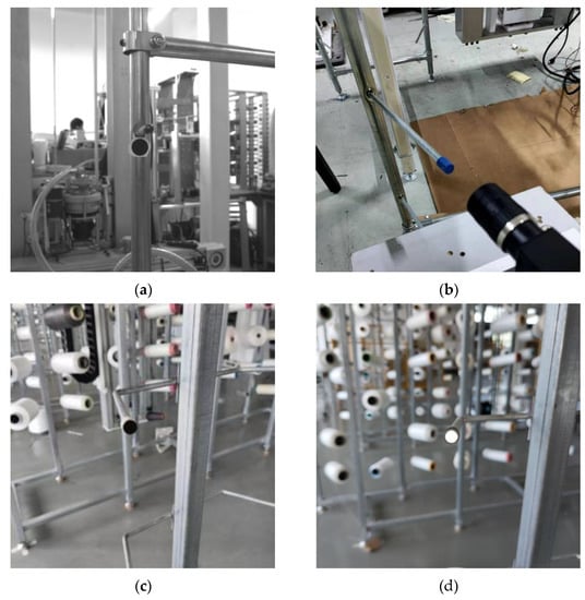 By analyzing the layout of the yarn frame in the yarn area and the structure of the yarn frame itself, we determined that the better installation positions of the markers are the support under the creel and the end face of the creel, as shown in Figure 5. The disc marker is directly pasted on the support under the creel, and the object is shown in Figure 5a. Its test recognition effect is fine, but it has high requirements for the camera installation mechanism, which is easy to interfere with. Moreover, due to the uneven end face of the creel, the direct pasting firmness and durability are poor, so it is only suitable for experimental testing. Moreover, since the image processing effect of the end face of the creel does not meet the actual requirements, it is considered to install the sleeve on the creel, as shown in Figure 5b. Moreover, it has the advantages of convenient installation, good durability, wide adaptability of yarn frame type, and the test recognition effect and shooting distance can also meet the requirements. So, it is a good choice for practical application. At the same time, in order to enhance the effect of image processing, we design the end face of the cover as a reflective surface on the basis of Figure 5b, and the actual effect is shown in Figure 5c.
