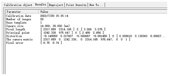 The specific camera parameters obtained after calibration are shown in Figure 11, key parameters are as follows. Focal Length (Focal length in X, Y axis direction , ) is [2317.659 2314.165] ± [3.266 3.275]. Principal Point (, ) is [1242.338 975.647] ± [2.490 2.656]. Distortion (Lens distortion coefficient) is [−0.149059 0.227607 −0.000687 −0.001450] ± [ 0.009618 0.130363 0.000270 0.000264]. The Camera Matrix is shown as Formula (10).