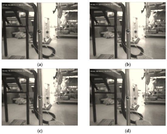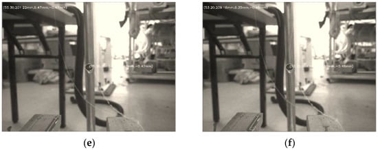 In order to ensure the positioning accuracy of the creel and prevent interference with the yarn frame, it is necessary to determine the optimal distance for camera positioning. We selected the distance between the camera lens center and the marker center 160 mm, 170 mm, 180 mm, 190 mm, 200 mm and 210 mm, respectively, then conducted a large number of image processing at these six distances. We randomly select one image of each interval, as shown in Figure 12a–f.