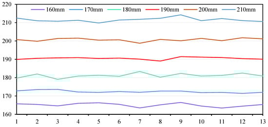 We selected six intervals of 160 mm, 170 mm, 180 mm, 190 mm, 200 mm and 210 mm, respectively, for testing. In order to ensure the accuracy of the positioning data, in the experimental test, 10 images were quickly collected each time as a group, and then the 10 images were processed to obtain the 10 data, and the average value of the 10 data was obtained as one data. A total of 13 sets of images were collected in the experiment, and finally 13 data were obtained. After calculation, 13 groups of data at six intervals were drawn into curves, which are shown in Figure 13.