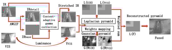In this paper, a new multi-scale algorithm is introduced to fuse the IR and VIS images. The proposed algorithm is based on the following two observations: (1) the dynamic ranges of the IR images could be narrower than those of the VIS images in the scenes which are composed of cloud, human subjects, trees, and plants or objects with similar temperature [36]; and (2) bright regions of the IR images usually include more details demanded by the VIS images. The gamma correction can be applied to increase the dynamic range of the IR image. Nevertheless, the gamma correction could magnify noise in smooth regions and the visual quality could be reduced. The adaptive weighted GIF (AWGIF) in [37] is adopted to decompose the IR image into two layers. Only the base layer is stretched by using a content-adaptive gamma correction algorithm. The detail layer is kept to prevent noise from being amplified. The proposed stretch component improves the image quality and reduces the color distortion of the fused image. The fusion is guided by a set of quality measures, such as contrast and exposedness, to extract useful information in both images, which are consolidated into weight matrices [38]. However, unlike the fusion of differently exposed VIS images [39,40], the measures in [38] are not always applicable to the IR images. The contrast measure range of the VIS image is often more expansive than the IR image. The weight matrices of the IR images will be smaller and the fused images tend to the VIS images, losing the useful information of the IR images. In order to better keep the corresponding information of the two images in the weight matrices and assign a high weight to important elements in the stretched IR images, the proposed algorithm performs mapping adjustment on the contrast measure of the stretched IR image. The regions with large intensities should be assigned larger weights than those with small values in the exposedness measure. The parts with higher brightness values in the IR image should be emphasized, such as humans. Therefore, different exposedness parameters are required to adjust the weights of the bright and dark regions. The proposed new weight matrices can strengthen and enrich important information to ensure that the fused image is in line with the human visual system before subsequent analysis and processing. In our experiments, our algorithm is compared with several state-of-the-art fusion algorithms on public datasets. The experiment results show that our algorithm can usually highlight salient objects better and have advantages in grasping the overall luminance contrast and vitality. It is suitable for low-light scenes and situations where the VIS and IR images in the grayspace are quite different, conforming to the human visual sense. The overall scheme of the proposed algorithm is shown in Figure 1. Two main contributions of this paper are: (1) a simple content-adaptive gamma correction algorithm, which stretches the dynamic range of the IR image according to the dynamic range of the VIS image. The algorithm can alleviate the possibly large differences between the dynamic ranges of the IR and VIS images. Subsequently, the excessive shifts of brightness and the color distortion of the fused images are significantly reduced; and (2) novel weight measures for the IR image, which can achieve weight matrices that are more in line with the characteristics. The weight matrices can be used for fusion with IR and panchromatic or RGB VIS images for a wide range of applicability.
