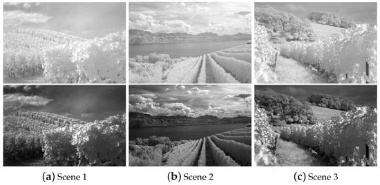 Dynamic range of an IR image could be narrower than the corresponding VIS image [36]. For example, trees and plants are highly reflective in the IR image and thus appear much brighter than they do in the VIS image. Cloud is usually white in an IR image. The IR image of a scene that is composed of trees, grass, and clouds has a narrow dynamic range. Eight examples are given in cases 1–8 in the first row of Figure 2. An IR image of a scene which consists of objects with similar temperature also has a narrow dynamic range.