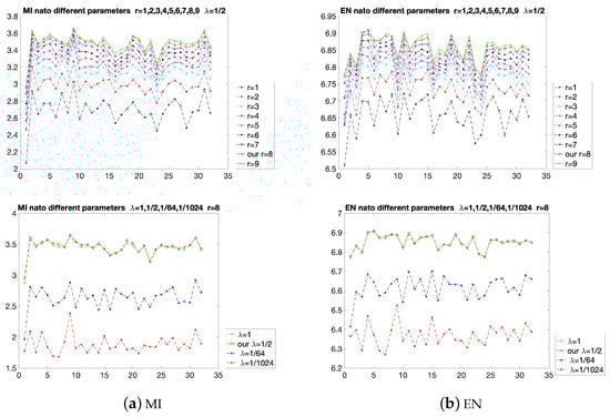 The results of the proposed method with different parameters are shown in Figure 5. The MI and EN are used to evaluate the parameters. The EN considers the statistical characteristics based on the unreferenced images, and the MI is used to measure the integrated information from the referenced source images. The choices of r are shown in the first row of Figure 5. It can be seen that when is fixed, adjusting the value of r will affect the evaluation indicators. As r increases from 1 to 8, although the increasing interval may be different, the overall value of the curve increases. However, when r is increased from 8 to 9, the values of some of the 32 points decrease, resulting in some turning points. Therefore, to avoid reducing the fusion effects at certain points, the value of r should be selected as 8. In the second row of Figure 5, r is fixed as 8, then is increased from to 1. Similar to the result of r, some turning points appear when is equal to 1. So the value of is selected as . In the experiments of comparison with state-of-the-art methods, is fixed at and r is fixed at 8, which have excellent visual effects in most fusion results.