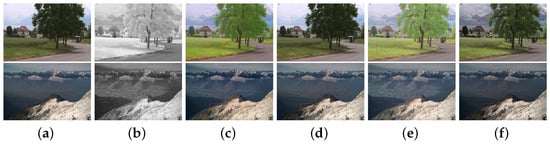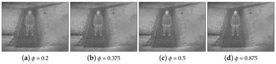 in Equation (15) is another adjustive parameter. With the increase in this parameter, the value in the exposedness measure of the point with the grayscale intensity greater than 0.5, such as 1, in the stretched IR image will rise, but it will not exceed 1. The brightness of the fused image in this part is improved. The effects of the fused images when takes different values are represents in Figure 6. Compared with (a), (b), (c), and (d) in Figure 6, it can be shown that when is larger than 0.375, which has little impact on brightness improvement. If it is too large, it will cause excessive brightness shifts in some scenarios, loss of details, and affect the quality of the image. The details are explained in the fifth subsection. Considering the above reasons, it is chosen as 0.375 as a compromise parameter.