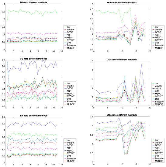 Similar to the result of the nato-camp sequences, the evaluation indicators of different scenes are shown in the right half of Figure 7. Our method is still very effective in the MI and CE. The more critical aspect of the fusion method should consider the relationship between the fused images and the original images. Although the EN of the proposed method is not the largest, the comparison results still show that our method has a strong correlation with the original images and is in line with the human visual perception. Table 4 shows the average results of scenes in Figure 7.