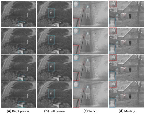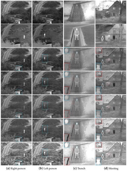 Except for the MLGCF and GFCE methods, the people in the fusion results of other methods are not prominent and can hardly be distinguished from the backgrounds in the first and second columns of Figure 8 and Figure 9. The fine details of the eaves and handrails are preserved better by the proposed method as shown in blue rectangles, which fully expresses the contrast information. Our proposed method, the MLGCF and GFCE methods highlight the target areas, which are conducive to subsequent tracking and detection. However, our proposed method preserves edge better and increases more dynamic range than the GFCE method, which is suitable for the human visual system. On the other hand, the GFCE adopts four-level decomposition while our method only decomposes once. Although the people can be displayed in all four images, the global luminance of the GFCE method is excessively enhanced that it is not comfortable for unaided eyes. The MLGCF method takes more than 10 times the execution time of our method, which is not friendly to real-time tasks. In the third column, the MLGCF and GFCE methods have almost no face details, as shown in blue rectangles. The Bayesian method has low brightness, and the backgrounds of the wavelets, MSVD, CVT, and DTCWT methods are not clear enough. In addition, from the third column of Figure 8 and Figure 9, all contrastive methods tend to produce more or less unnatural “shadow” artifacts in the trench, as shown in red rectangles, mainly due to the low global contrast of the IR images and noise. As for the fusion results listed in the fourth column of Figure 8 and Figure 9, the edge contours of the head in the MLGCF, GFCE, wavelets, MSVD, CVT, and DTCWT methods are not obvious enough, as shown in blue amplified boxes. The boundaries of the low building, the coat and the man are less clear in the ADF and Bayesian methods, as shown in red boxes. Overall, the proposed method highlights the people and considers global contrast and details. It can produce better fusion results for vision and further enhance the dynamic range of the whole scene.