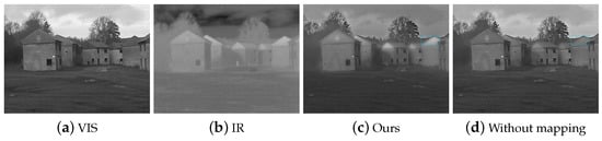 in Equation (15) decides the proportion of the intensity greater than 0.5 in the weight matrices in the image. A larger will make this effect more significant, thereby making the quality of the image even more degraded. For instance, as shown in Figure 12, the roof of the house is ribbed, and the gray level in the IR image is higher than that in the VIS image. Details of the VIS image are missed in the fused image. Fortunately, the problem could be overcome by designing an adaptive algorithm which will switch on the mapping according to different scenes. As shown in Figure 12d, the details of the VIS image are preserved better by disabling the mapping. In the future, we will develop such an adaptive algorithm.