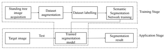 The process of standing tree image segmentation is shown in Figure 1, which mainly includes two stages: training and application. In the training stage, the standing tree images are captured by the cameras firstly, and the data augmentation method is used to expand them. Then, the images are labelled to construct the standing tree image training dataset. After this, the training dataset is inputted to train the semantic segmentation network. When the loss value approaches convergence, training stops, and a trained segmentation model is obtained. In the application stage, the target standing tree image is input into the trained model, and the segmentation result is obtained.