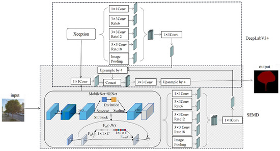 In SEMD, MobileNet+SENet is used in the encoder part as the backbone network. Using this structure, features can be extracted and calculated with any resolution. The ratio of the spatial resolution of the input image to the spatial resolution of the output image is used as the output stride. Multi-scale fusion of the features calculated by MobileNet+SENet using different atrous convolutions effectively reduces the executing time without affecting the segmentation accuracy. The decoder part mainly uses the same convolutional network to reduce the number of information channels and solve the problem of difficulty in training due to too many low-feature channels.