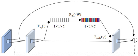 Among them, represents each feature channel; W and H represent the width and height of, respectively; represents the compression value of the c-th dimension channel; and , which mean the dimension decrease and increase respectively, are the weights of the full connection operation; is the ReLU function and is the sigmoid function. The function represents the first fully connected layer and is the second fully connected layer. Finally, by multiplying the scalar with the feature, , which represents a c-dimensional final feature, is obtained.