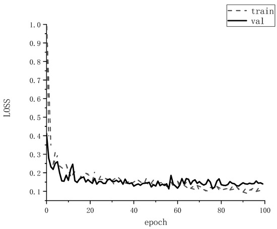 During training, the same set of training parameters are used, all defined according to the analysis above. Setting the initial learning rate Lr = 5 × 10−5, after 100 times of training, the model loss value is as low as 0.13, and the loss value of the loss function is shown in Figure 7. Therefore, the maximum number of training iterations is set to epoch = 100, 100 steps per train, and 50 steps for val. The batch size of this model is set to 8 due to the limitation of GPU memory. Some of the training hyper-parameters of the SEMD model are shown in Table 4.