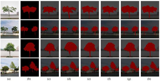 Comparison result of standing tree segmentation under complex backgrounds. (a) Original image. (b) Ground-truth. (c) FCN. (d) SegNet. (e) U-Net. (f) PSPNet. (g) DeepLabV3. (h) SEMD.