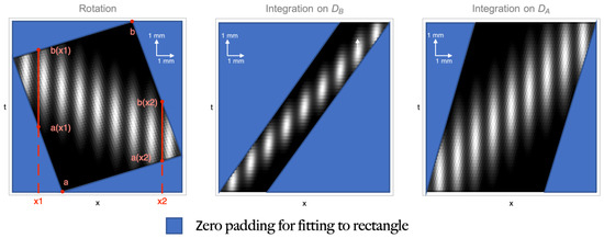 where θ = arctan 0.41 is the slope of the integration paths; the coefficients are obtained for the experimental parameters in Figure 1b. All the transformations line up the details along the vertical direction; however, the first one does it through a simple rotation of the ( x a , x b ) plane, the second one by applying a shear parallel to D A , and the third one through a shear along D B . The transformations are equivalent in refocusing the object, but the three boundaries defined by the lines in Equation (10) are rather different, implying a significant difference between the integration extremes in Equation (9).