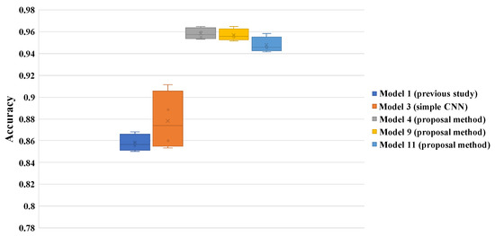 Classification results for the six classifications. Model 1 through Model 3 are prior studies, and Model 4 through Model 11 are proposed methods using deep metric learning. The details column provides details of the model. “Backbone” describes the main CNN model, and “Classifier” describes the classification method. In particular, Model 2 and Model 3 are described as “End to End" because feature extraction and classification are performed in one step.