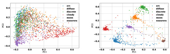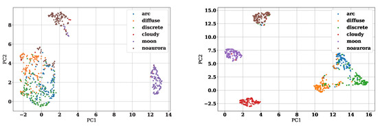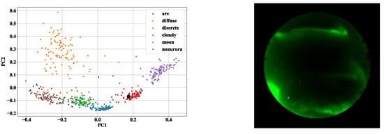 Next, we visualize feature vectors encoded from images to see whether deep metric learning is effective. We compressed these features into two dimensions using principal component analysis (PCA) and plotted the first principal component on the x-axis and the second principal component on the y-axis. Figure 4 and Figure 5 show the results. Figure 4 illustrates the feature vectors obtained by the Triplet Margin Loss model (Models 4 and 5), and Figure 5 illustrates the feature vectors obtained by the ArcFace model (Models 8 and 9). The left figure of Figure 5 shows features of the training data during the training of the first epoch of fold 0. On the other hand, the right figure shows the feature space of the training data at 15 epochs of fold 0. From Figure 4, we can see that clusters can be clearly separated for each label in the feature space as deep metric learning progresses. It also can be seen that the clusters of arc aurora, diffuse aurora, and discrete aurora are in close proximity to each other in the feature space of epoch 15. It indicates that these three auroras have similar characteristics and are more difficult to classify than the other categories. Although Triplet Margin Loss and ArcFace are different deep metric learning methods, it is clear that both are able to generate excellent feature spaces. The advantage of visualizing feature space is not only to get a rough idea of the characteristics of the data but also to check the data one by one, which is difficult for the model to infer correctly. Figure 6 shows the feature space of all training data. The large black dot in Figure 6 indicates the location of the image that is closest to the cloudy aurora cluster but is actually the moon aurora. This aurora image is attached at the right of Figure 6. Thus, by analyzing images that are difficult for the model to interpret, we can make great use of them to improve the model in the future.