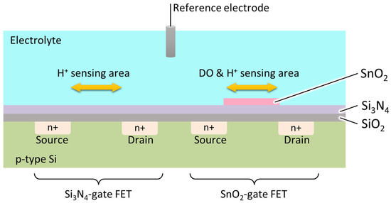 In this study, we propose a potentiometric DO-sensing device based on a field-effect transistor (FET). We used SnO2, which is an oxygen-sensitive material widely used in oxygen gas sensors and is seemingly used as a hydrogen ion-sensing film in ISFETs [11,12,13,14]. However, SnO2 is expected to respond to a variety of ions similarly to other metal oxides. Therefore, we propose a multimodal sensing approach to compensate for the insufficient selectivity and specificity by combining multiple sensors. As a first step in the development of the DO-sensing device based on the multimodal sensing concept, in this study, we focused on pH correction because it is expected that SnO2 will respond to both hydrogen ions and DO. We propose a device for the monolithic integration of a hydrogen ion-sensitive FET and a DO-sensitive FET onto a single chip, as shown in Figure 1. This is because the silicon nitride (Si3N4) thin film has ion selectivity only towards hydrogen ions. From the perspective of the multimodal sensing approach, selecting a material for the sensing membrane that can be formed by the CMOS compatible process is important for the monolithic integration of multiple sensors, and both SnO2 and Si3N4 satisfy the CMOS compatibility requirements. By simultaneously measuring the hydrogen ion concentration of the solution, that is, the pH, using an integrated hydrogen ion-sensitive FET, the hydrogen ion-induced output component of the SnO2-gate FET can be eliminated, and an accurate DO can be obtained. In this study, we fabricated a multimodal sensing device by monolithic integration of FETs with SnO2 and Si3N4 as the sensitive layers and measured its response to pH and different DO concentrations in solutions.