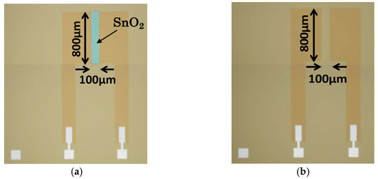 Optical microscope photo of the fabricated FET. (a) SnO2-gate FET; (b) Si3N4-gate FET.