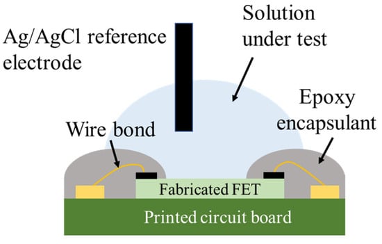 An optical microscopy image of the fabricated device is shown in Figure 3. The devices were encapsulated using an epoxy resin, leaving only the gates (sensing regions) exposed to the test solution. The responses of the SnO2-gate FET and Si3N4-gate FET to DO and hydrogen ions were investigated based on the drain current–gate voltage (Id–Vgs) characteristics.
