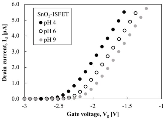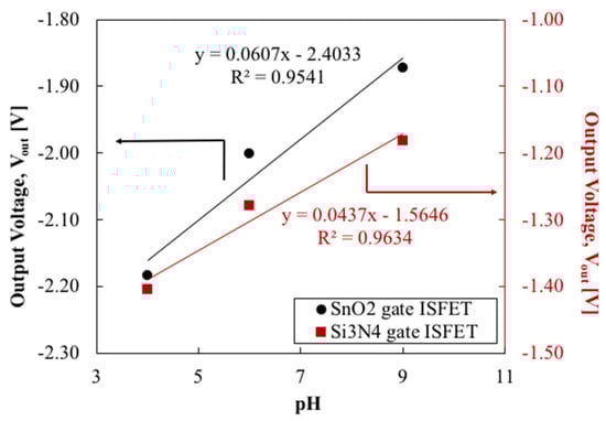 The change in Vout due to the change in pH is plotted in Figure 8. The SnO2-gate FET exhibited a pH sensitivity of 60.7 mV/pH and the Si3N4-gate FET exhibited a pH sensitivity of 43.7 mV/pH. The sensitivity of the Si3N4-gate FET is in line with the reported sensitivity [11] and obeys the Nernstian limit. However, the SnO2-gate FET exhibits a slightly super-Nernstian pH response, which is common in metal oxide-based pH sensors [23]. This may be due to the oxygen content of the solution and the structure of the oxide. Both FETs showed a satisfactory linear response to the pH. As for the pH measurement range, SnO2-gate FETs have been reported to demonstrate a measurement range of pH 2–10 [11], and Si3N4-gate FETs have been known to exhibit a suitable Nernstian response from pH 2 to 12 [24]. Similar characteristics can be expected for the fabricated devices, which have the same basic structure and use the same sensing material.