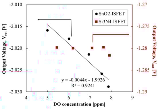 The change in Vg owing to the change in DO is plotted in Figure 9. The SnO2-gate FET exhibited a DO response with a sensitivity of 4 mV/ppm. Vout of the SnO2-gate FET decreased with increasing DO concentration. This response was not observed for the Si3N4-gate FET. These findings suggest that the SnO2 layer is DO-sensitive, whereas the Si3N4 layer is not. In this evaluation, the lowest measured DO was 5 ppm. If we assume that the FET response is linear to the amount of DO, the output voltage of the SnO2-gate FET at 0 ppm is expected to be −1.99 V, as shown in Figure 9. This is considered an acceptable value based on the characteristics of the FET as an electronic device. Although the details of the oxygen detection mechanism should be discussed separately, if the FET threshold is shifted in the positive direction because of oxygen adsorption on the sensing membrane surface, as assumed in Section 2.1, it may be possible to detect the absence of adsorbed oxygen, i.e., 0 ppm DO. As for the upper limit of measurement, the DO of the solution reaches equilibrium at approximately 8 ppm for air at room temperature and atmospheric pressure, which corresponds to the maximum DO value of the solution measured in this study. It is expected that even higher DO concentrations may be measured, but oxygen adsorption on the membrane surface will eventually saturate. A detailed evaluation of the lower and upper limits of DO measurement will require additional verification through an investigation based on an experimental system that allows a wider range of DO variation.