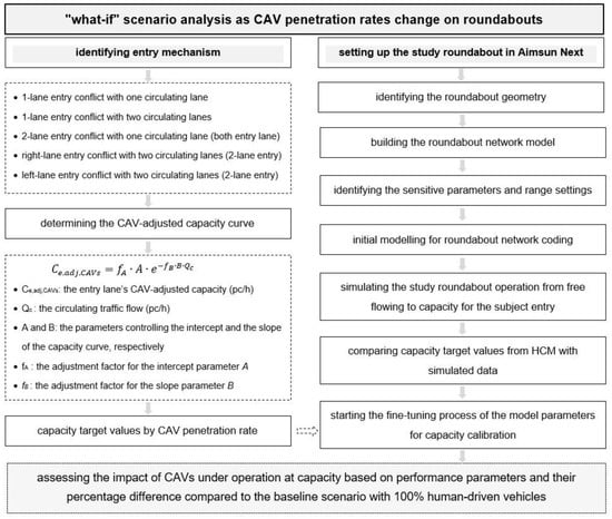 Based on the above, the scientific contribution of the research includes the analysis of the effects of the model parameters on the mechanisms of entry here examined and a synthetic insight to assess the potential benefits of the CAVs on roundabouts from an efficiency perspective. In turn, the societal contribution of the paper can be attributable to a greater understanding of the potential benefits of the CAV technologies to be implemented in traffic management strategies. Figure 1 shows the framework of the methodological path followed in this research.