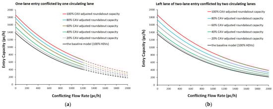 The baseline model for 100% HDVs and the CAV-adjusted roundabout capacity curves under different penetration rates of CAVs for: (a) the one-lane entry conflicted by one circulating lane (where dashed regression is extrapolated beyond the data); (b) the left entry lane of a two-lane entry conflicted by two circulating lanes (where the operational range depends on the geometry under study). Source: Own research based on data presented in [2].