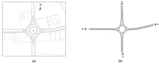 Starting from the geometry and traffic patterns observed in the field on existing roundabouts, “what-if” scenarios were conceptualised and analysed to assess the assumption-based behaviour of CAVs mixed with HDVs and to evaluate the effects of the progressive introduction of CAVs in traffic. Based on two case studies of an existing single-lane roundabout and a two-lane roundabout, two entry mechanisms (i.e., the entry mechanism 1 where the one-lane entry is conflicted by one circulating lane, and the entry mechanism 2 where the left entry lane in the two-lane entry is conflicted by two circulating lanes) were examined. The roundabouts in Figure 3a and Figure 4a were selected as case studies since they are representative examples of a single-lane roundabout and a large diameter (two-lane) roundabout, both appropriate to examine the entry mechanisms 1 and 2 above [1,2]. The selected roundabouts are installed in suburban areas similar to the urbanistic point of view where the availability of space in the transition between the countryside and the city, and the flat terrain, have favoured the radial alignment of the four legs at about a 90-degree angle; similar deflections through the roundabouts were also measured in the field. It should be noted that the priority rule to vehicles circulating around the central island and the curved trajectories on roundabouts may make the decision making by vehicles instead of human drivers even more challenging than at stop-controlled or signalised intersections. However, the geometry where the curved trajectories are predominant, enables traffic to enter, to circulate and to exit at speeds complying with the speed limit. The geometric design also enables appropriate sight distances to ensure drivers to perceive and react to the presence of conflicting vehicles. Surveys showed that both roundabouts had relatively balanced traffic flows from all the legs; low likelihood of daytime and night-time pedestrian activity was also observed since the intersections are far enough from the residential and commercial area of their respective cities. The size of the circulatory roadway and the entry (or exit) geometric design on the single-lane roundabout in Figure 3a cannot admit lane changing on them. In turn, the size of the circulatory roadway and the entry (or exit) geometric design of the two-lane roundabout in Figure 4a can admit lane changing (i.e., two vehicles can advance side by side or, depending on the availability of acceptable gaps, lane change may be possible). Again, the need for two headways equally probable in the inner lane and in the outer lane on the circulatory roadway to enter the two-lane roundabout makes the entry mechanism 2 more challenging than the mechanism 1 on the single-lane roundabout (see e.g., [1]).