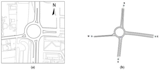 The two-lane roundabout (roundabout 2): (a) the sketch of the roundabout; (b) the network model built in Aimsun Next with labels for the centroids (N: North; S: South; E: East; W: West).