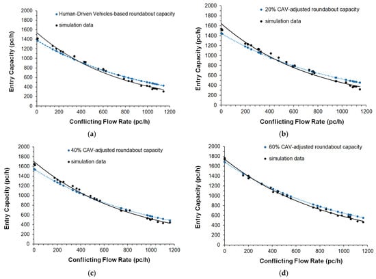 Comparisons between the CAV-adjusted and simulated entry capacity data for different market penetration rates of CAVs and HDVs for the entry mechanism 1 (i.e., one-lane entry conflicted by one circulating lane) listed as: (a) baseline scenario: 0% CAVs and 100% HDVs; (b) scenario 1: 20% CAVs and 80% HDVs; (c) scenario 2: 40% CAVs and 60% HVs; (d) scenario 3: 60% CAVs and 40% HDVs; (e) scenario 4: 80% CAVs and 20% HDVs; (f) scenario 5: 100% CAVs and 0% HDVs. Notes: to explain the entry mechanisms 1 reference has been made to the eastbound entry in Figure 3a; the black line and dotted blue line regressions were extrapolated by the data.