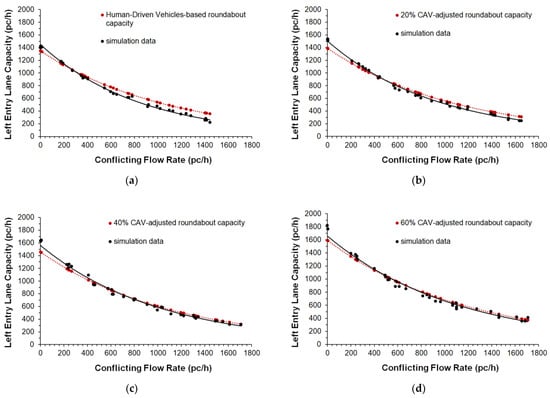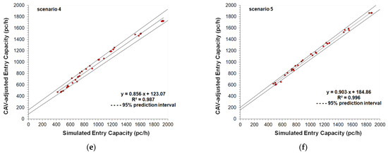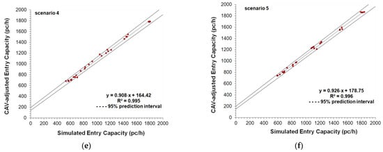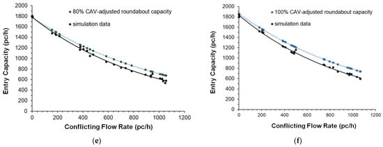 Scattergram analysis to compare the CAV-adjusted versus simulated entry capacity data for different proportion of CAVs and HDVs for the entry mechanism 2 (i.e., the left entry lane of two-lane entry approach conflicted by two circulating lanes) listed as: (a) baseline scenario: 0% CAVs and 100% HDVs; (b) scenario 1: 20% CAVs and 80% HDVs; (c) scenario 2: 40% CAVs and 60% HDVs; (d) scenario 3: 60% CAVs and 40% HDVs; (e) scenario 4: 80% CAVs and 20% HDVs; (f) scenario 5: 100% CAVs and 0% HDVs. Note: to explain the entry mechanisms 2 reference has been made to the northbound left entry lane entry in Figure 4a.