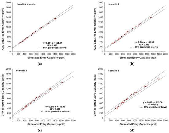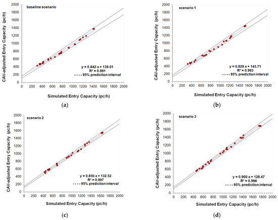 The parameter called cooperate in creating a gap was also activated in the Cruise Control Status of Aimsun Next [25]; specifically, this parameter ranging from 0.00 to 1.00 (where the value of 1.00 means high aggressiveness) can affect the entry mechanism 2, since at the two-lane roundabout the vehicles can cooperate in creating a gap to be accepted for a lane change. A moderate aggressiveness level of 0.50 was set also taking into account the speed limit on the roundabouts. Other model parameters such as the normal deceleration (i.e., the maximum deceleration that the vehicle can use under normal conditions), the maximum deceleration (i.e., the most severe braking that a vehicle can apply under special circumstances, such as emergency braking in front of a traffic light), the headway aggressiveness that modifies the relationship of the inter-vehicle distance as a function of the speed, were also tested, however, without the expected benefit on the fine-tuning of the model parameters. At last, the fine-tuned values of the parameters in Table 2 express a realistic trade-off in order to avoid large enough headways to significantly reduce the entry capacity, or short enough headways to return excessively improbable increases in capacity. The comparisons of the capacity target values with the simulated capacities, and the scattergram analysis for the entry mechanism 1 are shown in Figure 5 and Figure 6, respectively; Figure 7 and Figure 8 show the analogous comparisons and the scattergram analysis for the entry mechanism 2. Specifically, Figure 5 and Figure 7 show the comparisons between the CAV-adjusted and simulated capacities under different CAV penetration rates in traffic for the entry mechanism 1 and the entry mechanism 2, respectively. In all the scenarios, the entry capacity is progressively reduced as the circulating flow increased; in turn, the entry capacity increased as the penetration rates of CAVs increased. In turn, Figure 6 and Figure 8 show the corresponding scattergram analysis for the entry mechanism 1 and the entry mechanism 2, respectively; these graphs show the regression lines of the CAV-adjusted versus the simulated capacities plotted along with the 95% prediction intervals. Thus, the models can be accepted as they replicated as accurately as possible the phenomenon under analysis based on a specific level of agreement between the CAV-adjusted and simulated entry capacities for the different simulation scenarios [24].