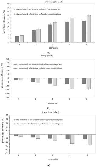 Operating conditions at capacity were simulated in Aimsun Next for the two mechanisms of entry which we examined since the presence of CAVs is expected to create an incentive to operate the entry mechanisms at a high level of utilization. The higher the proportion of the CAVs in traffic, the more frequently the benefits of connectivity can be obtained, since more vehicles can accept smaller gaps safely. There is also consistency with the research findings that the literature presents, since the proportion of the traffic that is made of CAVs influenced the increases in capacity (e.g., [51]). To take some examples, if there are 40% of CAVs (i.e., scenario 2), compared to the baseline scenario the entry capacity increased by about 15.00% in the case of the entry mechanism 1 and about 17.00% in the case of the entry mechanism 2 (see Figure 9a). Similarly, in scenario 3 with the CAV penetration rate of 60%, a significant reduction of the delay and travel time values was achieved for the single-lane entry with percentage differences up to about 13.50% and 11.00%, respectively (see Figure 9b,c). There was also a significant reduction of the delay and travel time values for the entry mechanism 2 with percentage differences about of 18.78% and 16.68%, respectively (see Figure 9b,c). However, the slightly higher percentage reductions achieved for the entry mechanism 2 compared to the entry mechanism 1 are depending on the more assertive driving required to enter the two-lane roundabout, where the entering vehicle is conflicted by two traffic streams on the circulatory roadway. Consistently with the literature (e.g., [77]) the percentage differences of delay and travel time tend to be stabilized transitioning towards a fully CAV fleet (see Figure 9b,c). Despite similar trends in both entry mechanisms, however, further layouts of roundabouts should be studied to better understand how the roundabout design standards should be updated in order to improve the existing road network in terms of traffic efficiency and to make it appropriate for the progressive introduction of CAVs in traffic.