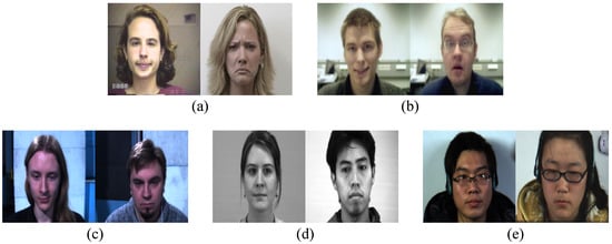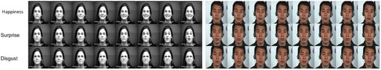 Facial expressions can be divided into two main categories: macro-expression and micro-expression. Macro-expressions appear on our faces without any oppression when emotions are usually expressed. Macro-expressions are easy to recognize because of their long duration (0.25–4 s), and the emotion to be revealed is clearly expressed. Examples of each dataset we used are shown in Figure 7. The details of the macro-expression datasets are as follows: