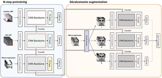 In this paper, we also propose a deep learning-based micro-expression recognition method. The methods mentioned earlier have not adequately utilized the pre-trained model and are dependent on additional information such as landmarks and optical flow. Therefore, we propose a novel method that uses a pre-trained model that learns large amounts of data across the N-step and a transformation method specialized in facial datasets called Decalcomanie. We emphasize that we utilize massive datasets with unrelated domains to facial in multistep pre-training, although Hung et al. [] only utilized relevant domain datasets.