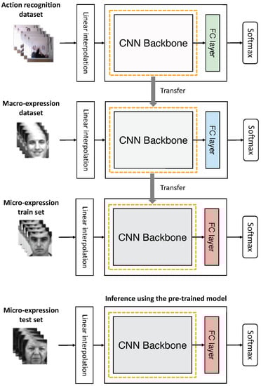 Deep learning-based methods have performed better than hand-crafted feature-based methods in the field of computer vision in recent years. Therefore, studies using the deep learning-based method have been actively proposed even in micro-expression recognition. Wu et al. [] used a three-stream combining 2D and 3D convolutional neural network to classify expressions and proposed two variants: intermediate fusion and late fusion. Xia et al. [] improved the performance by adversarial learning using both the micro-expression dataset and the macro-expression dataset. Recently, Hung et al. [] proposed multilevel transfer learning for a macro-expression dataset. They used related domain datasets for pre-training and performed experiments on the macro-expression dataset.