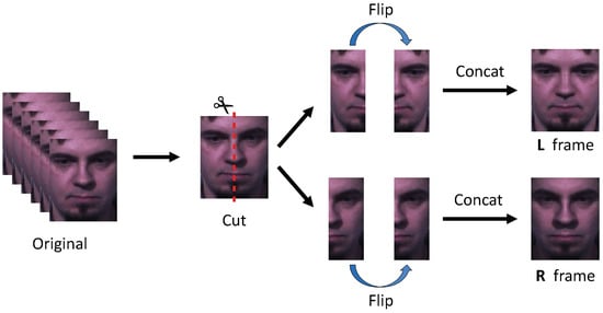 Procedure of Décalcomanie augmentation. First, we cut all the frames in half. We flip the cut left and right face frames, respectively, and concatenate the half-frame before flipping it to create new frames. We denote the new frame made of only the left faces and the new frame made of only the right faces as the L and R frames, respectively.