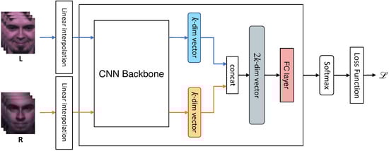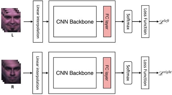 As the video clips of micro-expression datasets used in this paper are not inverted, as when looking in a mirror, the left face and right face of the subject are originally right-side and left-side, respectively. However, to facilitate understanding and avoid confusion, we refer to the left and right faces as the left and right sides when looking at the video clip. If Décalcomanie is applied, the left- and right-side frames can be obtained alongside the original ones. Because three kinds of the frames can be obtained, a new training process was required to learn the additional samples. Therefore, we propose two versions of training process: (1) shared backbone and multiple losses, and (2) fusion with shared backbone.