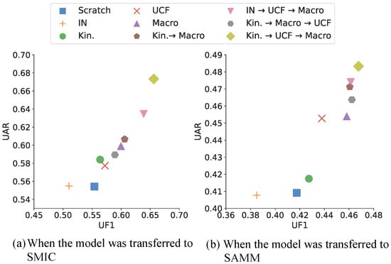 Finally, when the macro-expression dataset was used for pre-training in the last step, we compared the Scratch, Macro, Kinetics → Macro, IN → UCF → Macro, and Kinetics → UCF → Macro to evaluate whether performance improves as the number of steps increases. As a result, we confirmed that, with more steps, performance improved. Furthermore, when comparing IN → UCF → Macro and Kinetics → UCF → Macro, which used the same three-step pre-training, the performance of Kinetics → UCF → Macro was better than that of IN → UCF → Macro, which is presumed to have been caused by the presence or absence of temporal information, as mentioned.