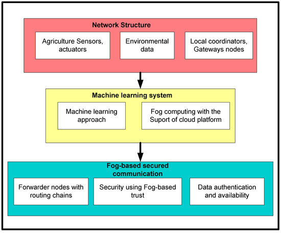 Figure 2 depicts the block diagram of the proposed framework. It is comprised of three sub-blocks, i.e., network structure, machine learning system, and fog-based secured communication. Firstly, sensors, actuators, gateways, and other communication devices initialized themselves for sensing and forwarding agricultural data. The sensors continuously record environmental information, which is then sent to sink nodes via local coordinators or gateways. Second, a machine learning-based technique was created to reduce the communication overheads of the sensor nodes. Finally, the proposed system adopts the distributed regression function to assess the various attributes of the system and achieves efficient node management [42]. Moreover, the machine learning approach not only balances the load over the multiple routes, but the proposed framework can also identify the redundant nodes. Duplicate data are therefore prohibited from entering in proximity to fog nodes. In the end, a fog-based secured scheme is developed with the intelligence of fog nodes and cryptographic techniques. Fog nodes perform dual functionalities for communication with both the IoT system and cloud platform. This validates the authenticity of incoming packets, and accordingly, appropriate actions are taken. In the case of authorized nodes, they are allowed to send the data towards the cloud system or the request packets are dropped by the fog nodes. The information is recorded in the table about false messages and non-authentic devices.