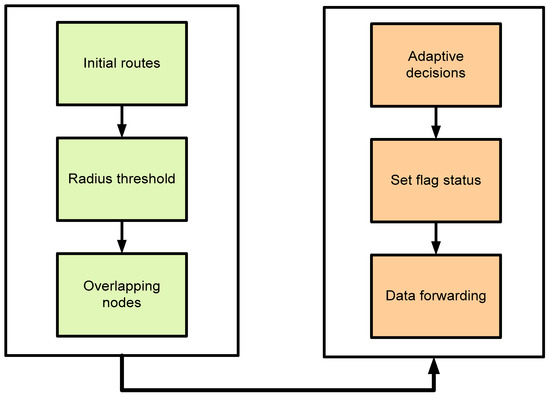 Based on the undirected graph, the proposed framework identifies the initial and temporary routes ). The selected routes are based on the distance factor and each node maintains its neighbor table in a controlled manner. By exploring the neighbor table, each node formulates a route to the sink node for data transmission. To attain an efficient routing scheme with balances the load and bandwidth utilization, the proposed framework initiates the nodes management activity on the routes . Let us consider that has a data to transmit to the sink node. Then, the proposed framework first identified the overlapping nodes that lay in the same transmission range. If any such nodes exist, then set their flag’s value in the routing table. The flag value indicates the forwarding status of the nodes. Let us suppose that is the distance threshold of the node, and is the predefined radius. To determine the overlapping nodes, the proposed framework exploits the search zone candidate nodesbased on the and , as given below
