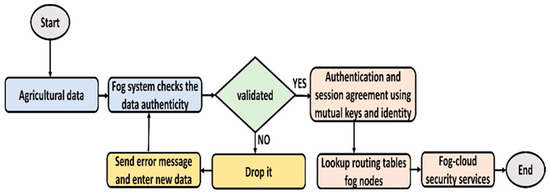 Figure 4 explains the security algorithm for transmitting agricultural data with the support of fog nodes. It clarifies the fog-based trust mechanism with privacy concerns and reliability. Accordingly, the proposed security algorithm decreases the probabilities of network attacks and stabilizes the communication system. Fog nodes are utilized as a bridge to facilitate both the IoT and cloud systems. Firstly, fog nodes verified the incoming agricultural data, and upon its validation, authentication and session agreement are established. The session agreement is valid for a particular time and needs to be refreshed later for further communication. In case verification is unsuccessful, then the error message is generated towards the data originating node. Additionally, fog nodes construct routing paths for data forwarding by exploring the routing table. The routing information is updated and evaluated each time that data transmission is needed. In the end, fog and cloud ensure data security using cryptography-based digital signature and encryption techniques. Such a technique provides high-level security measures to the upper layers.