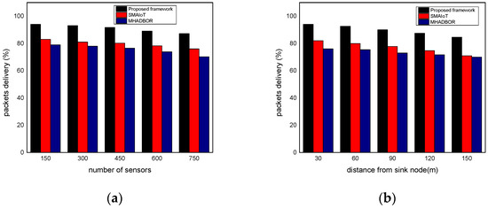 (a) Packets delivery with varying sensors and (b) Packets delivery with varying distance.