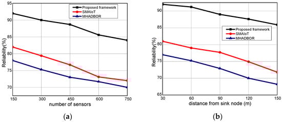 (a) Reliability with varying sensors and (b) Reliability with varying distance.