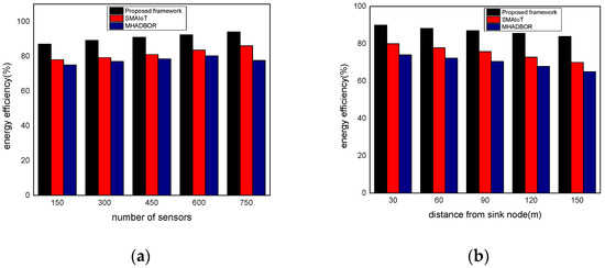 (a) Energy efficiency with varying sensors and (b) Energy efficiency with varying distance.