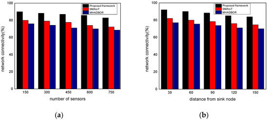 (a) Network connectivity with varying sensors and (b) Network connectivity with varying distance.